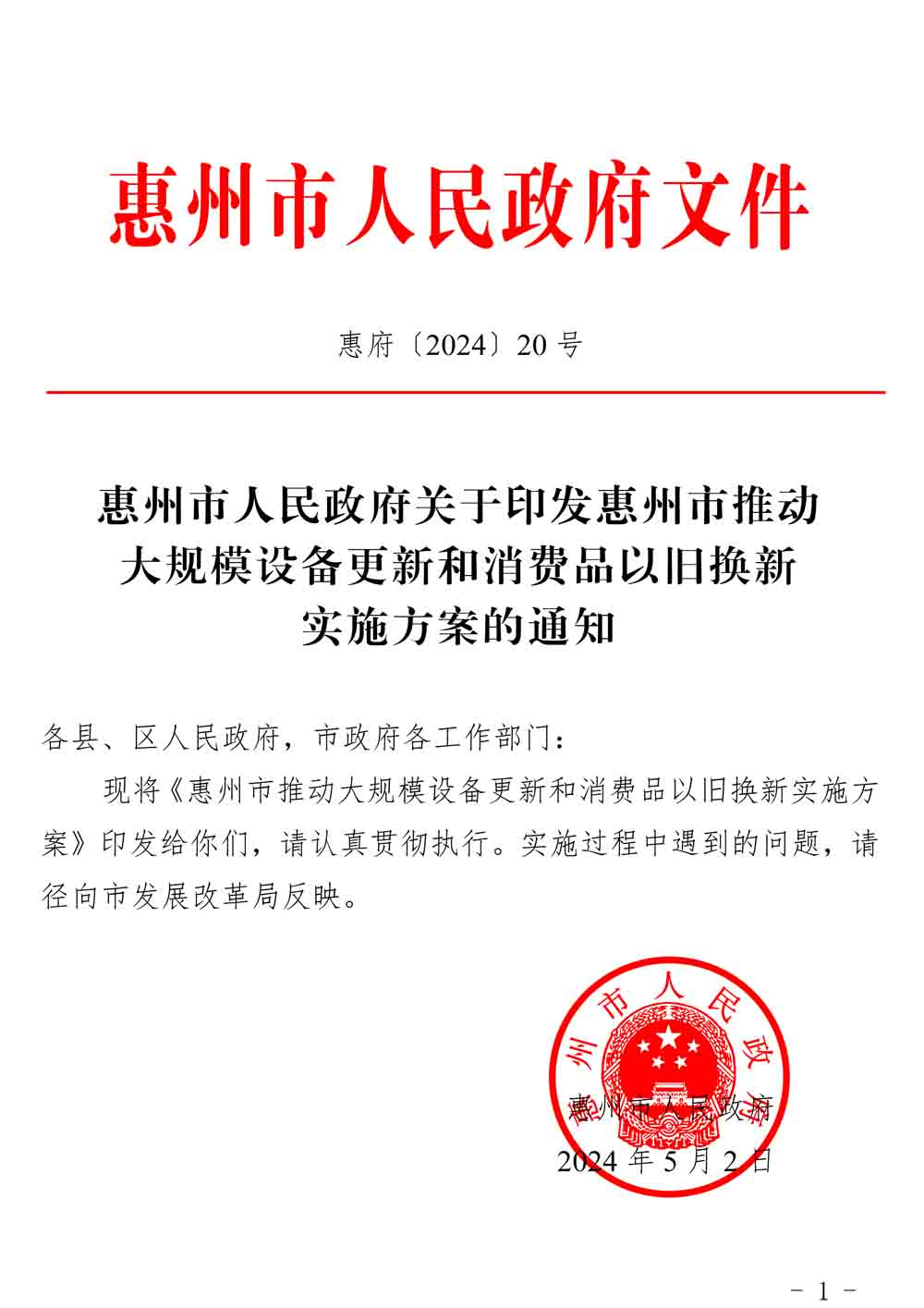 惠州市人民政府關于印發惠州市推動大規模設備更新和消費品以舊換新實施方案的通知(惠府〔2024〕20號)